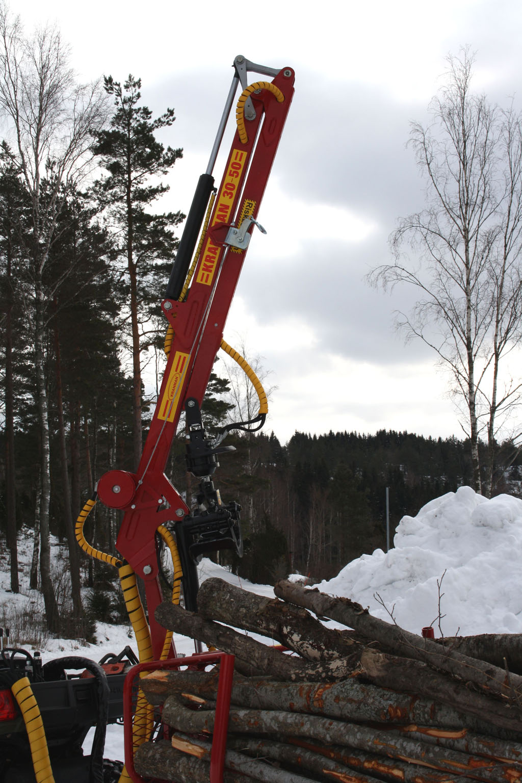 Vår ATV timmergrip kan monteras på kranen på våra miniskotare, för lastning och tömning vid transport av till exempel ris, sly och material som uppstår vid röjning och gallring i skog och natur.